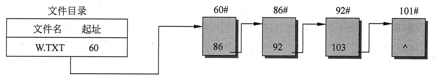 例如,文件W.TXT占用了60、86、92、103号物理块,文件的起始块号60放在文件说明中,如下图所示。