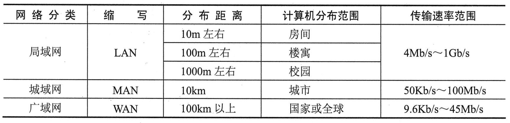 根据计算机网络的覆盖范围和各机器之间相隔的距离不同,可以将计算机网络分成局域网、城域网和广域网。下表给出了这三类网络的特征参数。