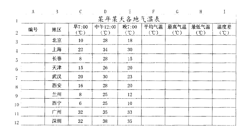 1.表格要有可视的边框,并将表格标题“某年某天各地气温表”设置为居中、楷体、16磅、蓝色,表格内容设置为居中、宋体、11磅、黑色。