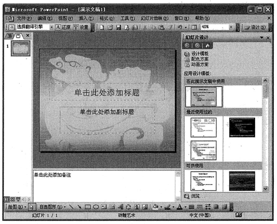 (1)打开演示文稿,单击“格式”工具栏上的“设计”按钮,系统显示“幻灯片设计”任务窗格,如下图所示。