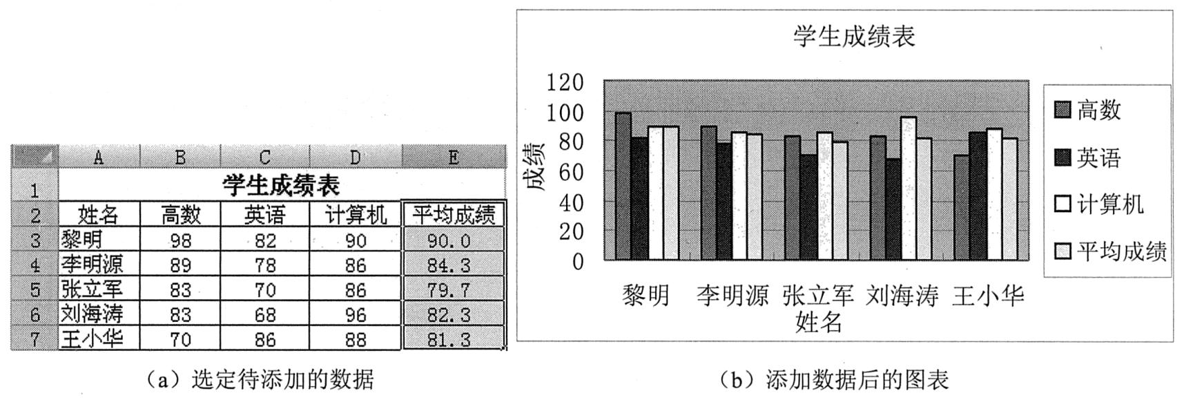 (1)向图表工作表中添加数据:可将工作表中的数据复制到图表中,下面以上图为例说明添加“平均成绩”的操作过程。