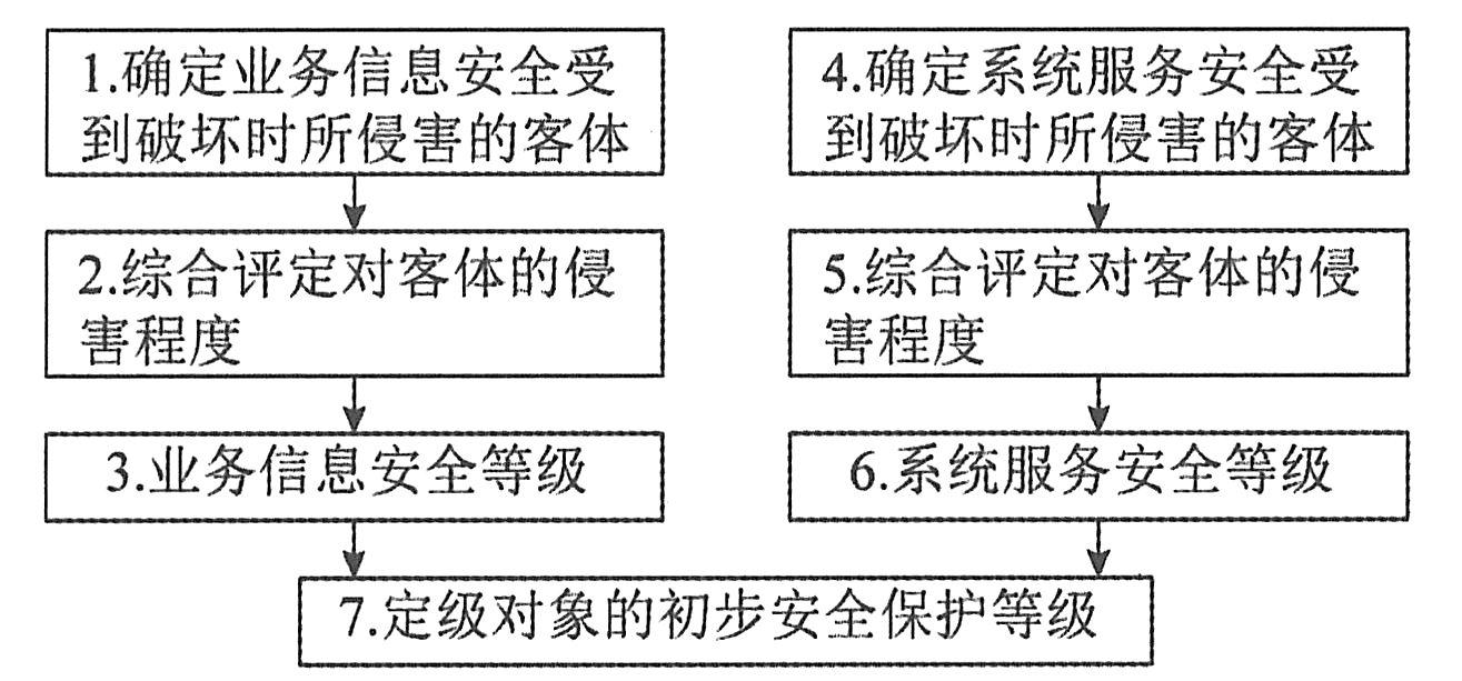 网络安全等级保护工作主要包括定级、备案、建设整改、等级测评、监督检查五个阶段。定级对象建设完成后,运营、使用单位或者其主管部门选择符合国家要求的测评机构,依据《信息安全技术网络安全等级保护测评要求》等技术标准,定期对定级对象的安全等级状况开展等级测评。其中,定级对象的安全保护等级分为五个,即第一级(用户自主保护级)、第二级(系统保护审计级)、第三级(安全标记保护级)、第四级(结构化保护级)、第五级(访问验证保护级)。定级方法如下图所示。