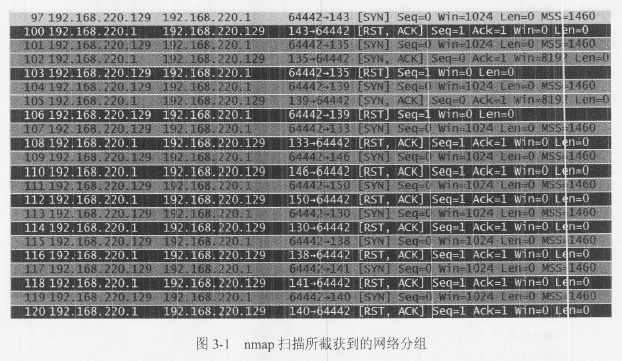 图3-1是在执行命令nmap -sS *.*.*.*时所捕获到的网络分组。