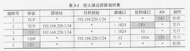 补全表3-1所示的防火墙过滤器规则的空(1) - (5),达到防火墙禁止此类扫描流量进入和处出网络,同时又能允许网内用户访问外部网页服务器的目的。