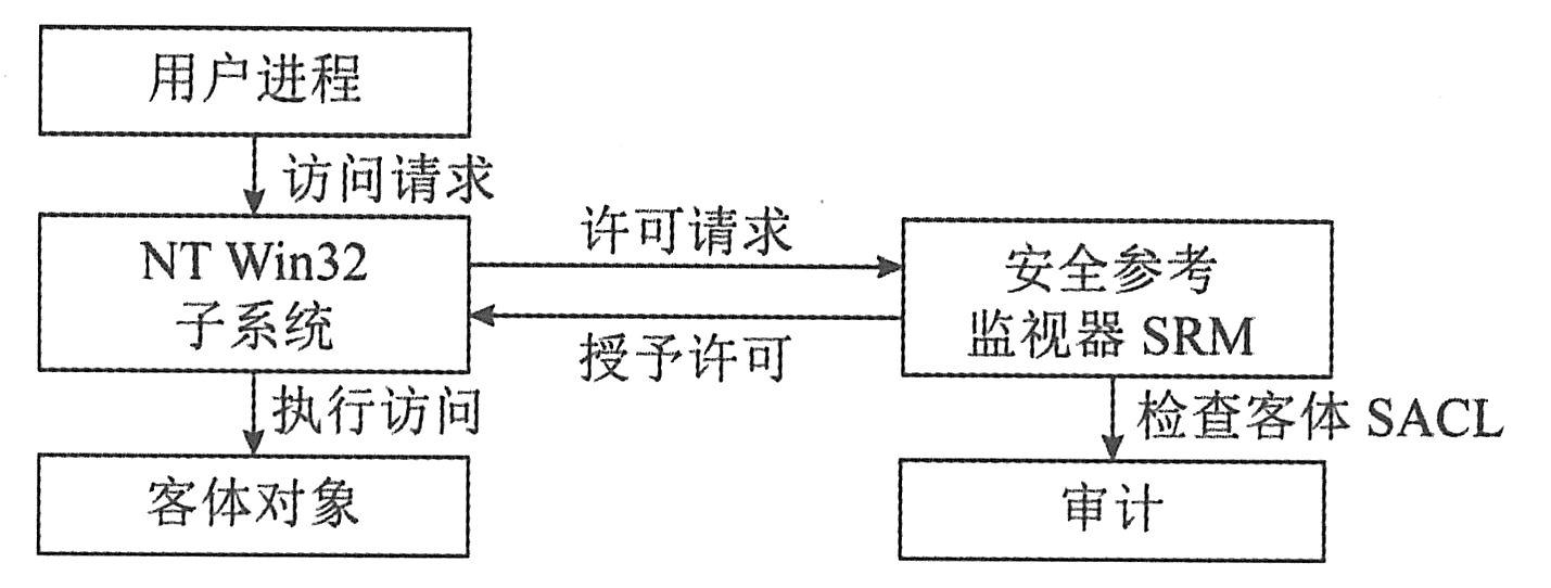 Windows用户登录到系统时,WinLogon进程为用户创建访问令牌,包含用户及所属组的安全标识符(SID),作为用户的身份标识。文件等客体则含有自主访问控制列表(DACL),标明谁有权访问,还含有系统访问控制列表(SACL),标明哪些主体的访问需要被记录。用户进程访问客体对象时,通过WIN32子系统向核心请求访问服务,核心的安全参考监视器(SRM)将访问令牌与客体的DACL进行比较,决定客体是否拥有访问权限,同时检查客体的SACL,确定本次访问是否落在既定的审计范围内,是则送至审计子系统。整体过程如下图所示。
