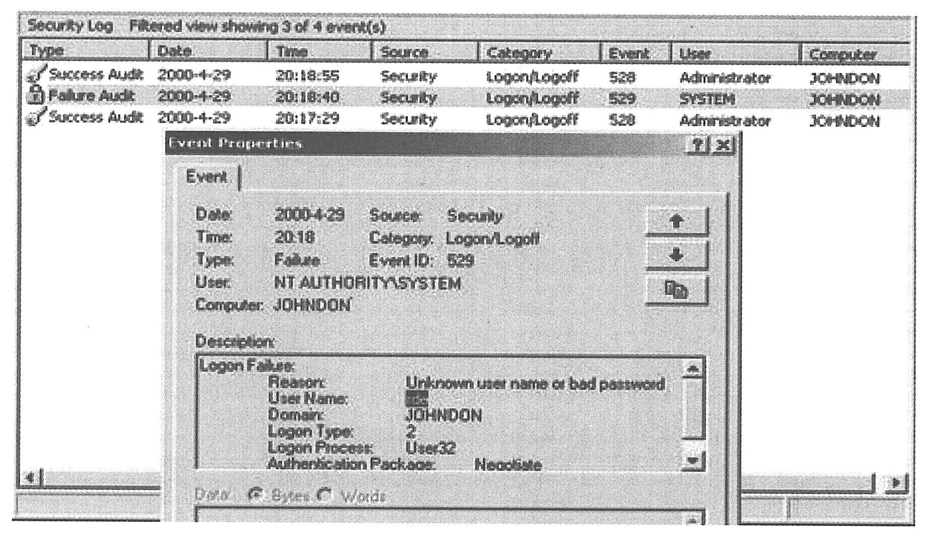 审计数据如下图所示,这是Windows 2000事件查看器中列出的部分登录事件,其中用户rde的一次登录失败。
