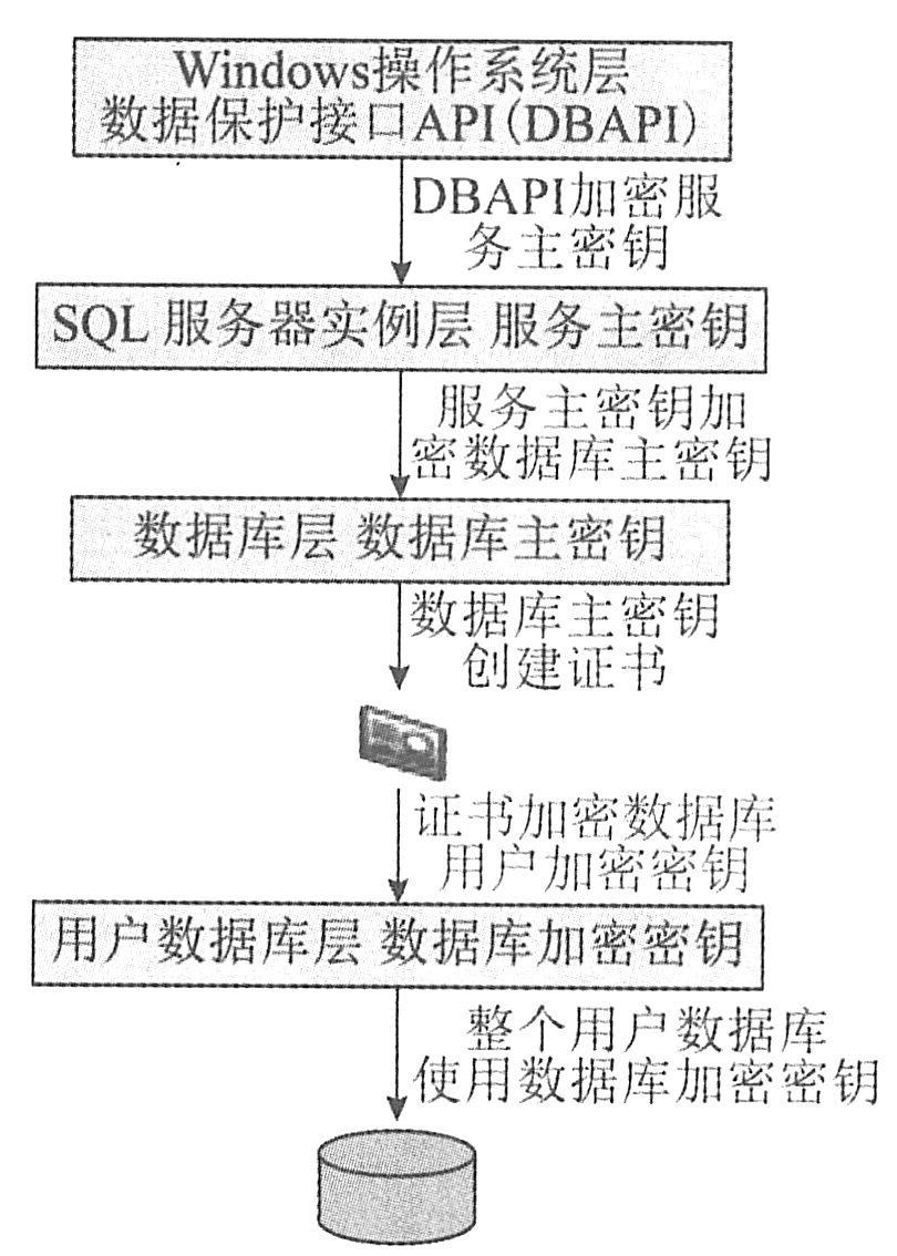(3)数据库加密。SQL保密Server提供Transact-SQL函数、非对称密钥、对称密钥、证书、透明数据加密机制。MS SQL Server 2008提供透明数据库加密服务。透明加密使用不同密钥对不同敏感数据进行加密处理,其中密钥类型有服务主密钥、数据库主密钥、数据库密钥,各密钥的使用如下图所示。