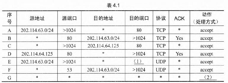 问题:4.1   假设某企业内部网(202.114.63.0/24)需要通过防火墙与外部网络互连,其防火墙的过滤规则实例如表4.1所示。
