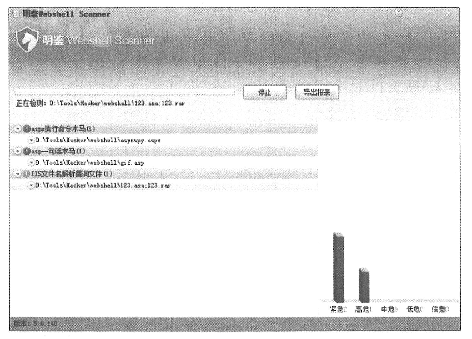 用漏洞扫描工具定期对网站服务器进行漏洞扫描,及时发现网站的安全漏洞,产生漏洞评估报告,以指导网站管理员对网站服务器进行升级或修改安全配置。网站漏洞扫描技术主要有端口扫描、Web漏洞扫描、WebShell恶意代码检测。针对网站的开源漏洞扫描工具有Nikto、Httprint、WebScarab、WireShark,商业化漏洞扫描工具有AIScanner安全检测系统、明鉴Web应用弱点扫描器、明鉴WebShellScanner网页后门检查工具、IBM公司AppScan等。例如,利用明鉴WebShellScanner,可以检测网页木马,如下图所示。