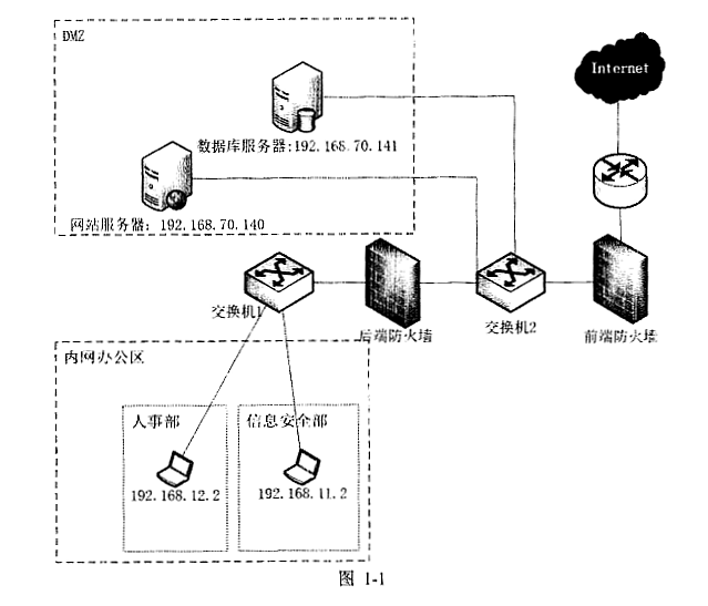 在某政府单位信息中心工作的李工主要负责网站的设计、开发工作。为了确保部门新业务的顺利上线,李丁邀请信息安全部的王工按照等级保护2.0的要求对其开展安全测评。李工提共网站所在的网络拓扑图如图1-1所示,图中,网站服务器IP地址是192.168.70.140数据车库服务器的IP地址是192.168.70.141。
