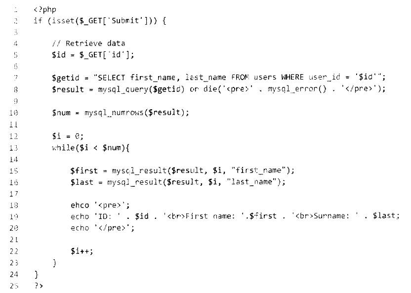 按照网络安全测评的实施方式,测评主要包括安全功能检测、安全管理检测、代码安全审查、安全渗透、信息系统攻击测试等。王工调阅了部分网站后台处理代码,发现网站某页面的数据库查询代码存在安全漏洞,代码如下:
