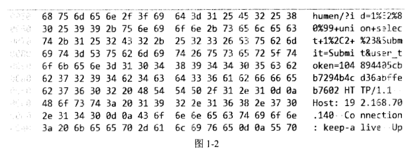 (4)Snort入侵检测系统部署不久,就发现了一起网络攻击。李工打开攻击分组查看,发现很多字符看起来不像是正常字母,如图1-2所示,请问该用哪种编码方式去解码该网络分组内容?