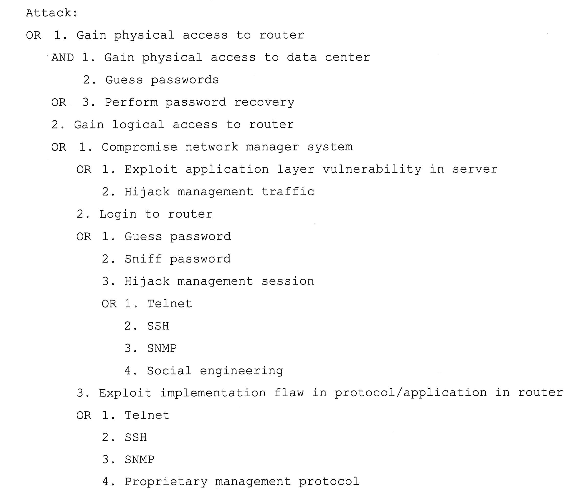 攻击树方法起源于故障树分析方法。故障树分析方法主要用于系统风险分析和系统可靠性分析,后扩展为软件故障树,用于辅助识别软件设计和实现中的错误。Schneier首先基于软件故障树方法提出了攻击树的概念,用AND-OR形式的树结构对目标对象进行网络安全威胁分析。例如,侵害路由器攻击树描述如下。