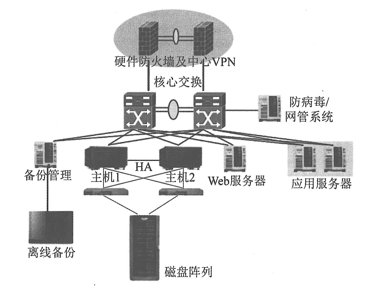 对于重要的系统及数据资源,采取磁盘阵列、双机在线备份、离线备份等综合安全措施,保护存储数据及相关系统的正常运行。如下图所示是某行业系统推荐的网络基础设施平台硬件系统高级配置安全解决方案。其中,存储安全采取了离线备份、磁盘阵列等相关技术。