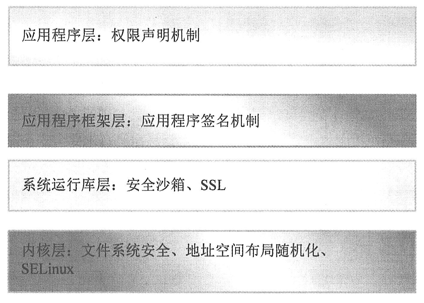 权限声明机制,为操作权限和对象之间设定了一些限制,只有把权限和对象进行绑定,才可以有权操作对象。当然,权限声明机制还制定了不同级别不同的认证方式的制度。在默认情况下Android应用程序不会被授予权限,其权限分配根据Android应用APK安装包中的Manifest文件确定。应用程序层的权限包括normal权限、dangerous权限、signature权限、signatureOrSystem权限。normal权限不会给用户带来实质性的伤害;dangerous权限可能会给用户带来潜在威胁,如读取用户位置信息,读取电话簿等,对于此类安全威胁,目前大多数手机会在用户安装应用时提醒用户;signature权限表示具有同一签名的应用才能访问;signatureOrSystem权限主要由设备商使用。