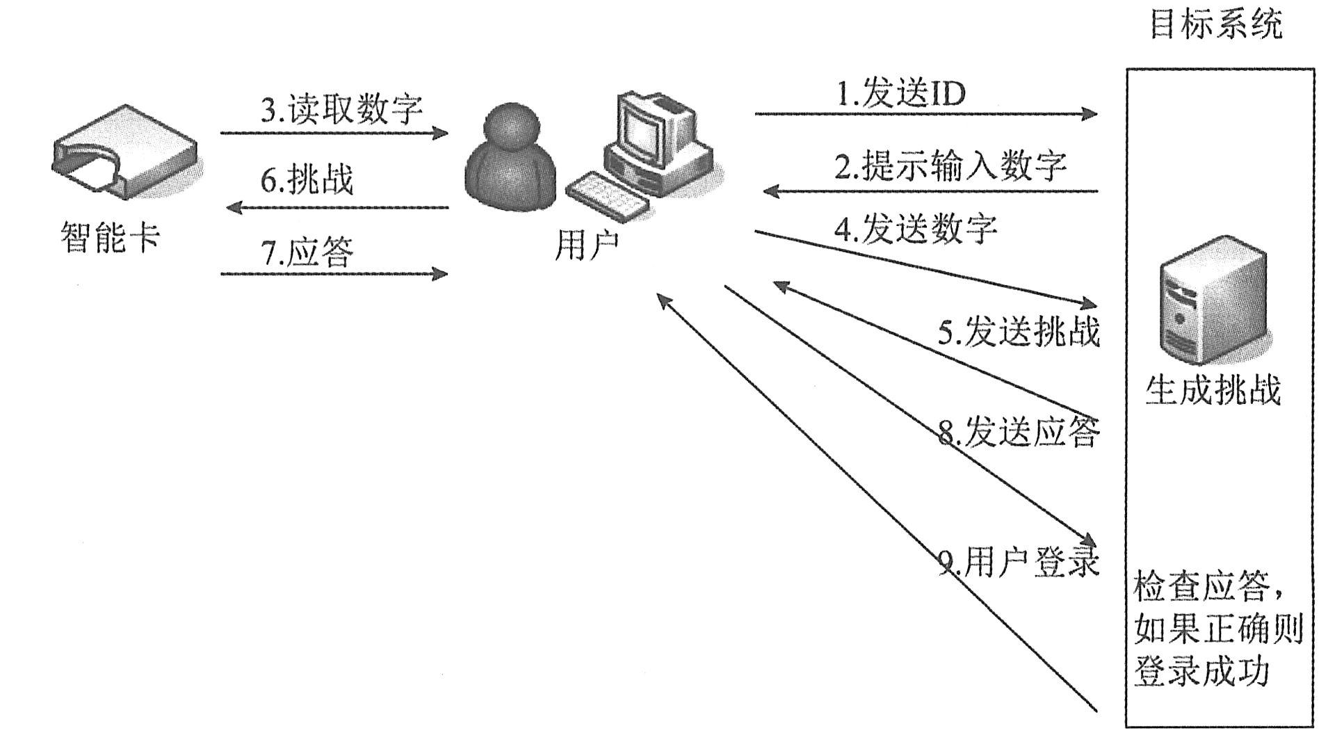 智能卡是一种带有存储器和微处理器的集成电路卡,能够安全存储认证信息,并具有一定的计算能力。智能卡认证根据用户所拥有的实物进行,智能卡认证技术广泛应用于社会的各个方面。如下图所示,通过智能卡来实现挑战/响应认证。在挑战/响应认证中,用户会提供一张智能卡,智能卡会一直显示一个随时间而变化的数字。假如用户试图登录目标系统,则系统首先将对用户进行认证,步骤如下: