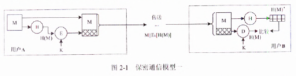 (5分) 为了在传输过程中能够保障信息的保密性、完整性和不可否认性,设计了一个安全通信模型结构如图2-3所示: