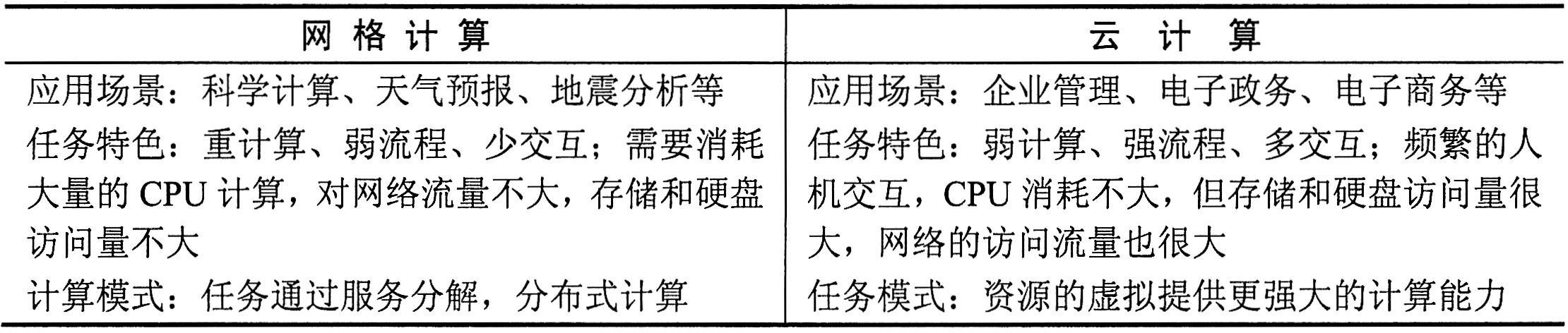 网格计算是一种计算能力提升的方式,其原理是依据并行计算理论,通过任务分解,将子任务分布式提交到其他服务器上运行,以获得更强大计算能力。网格计算的基础技术就是Web Services。云计算的平台技术,主要依赖于SOA,而我们知道SOA的主要实现技术体系也就是Web Services,因此云计算和网格计算的核心技术基础是相似的,但也有所不同,如下表所示。