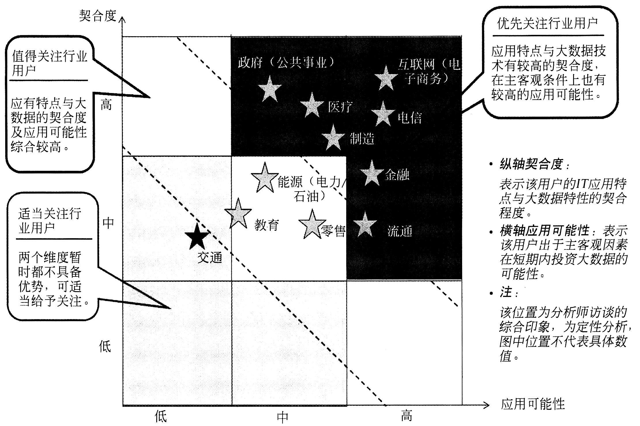 大数据受到越来越多行业巨头们的关注,使得大数据渗透到更广阔的领域,除了电商、电信、金融这些传统数据丰富、信息系统发达的行业之外,在政府、医疗、制造和零售行业都有其巨大的社会价值和产业空间。各行业在大数据应用上的契合度如下图所示。