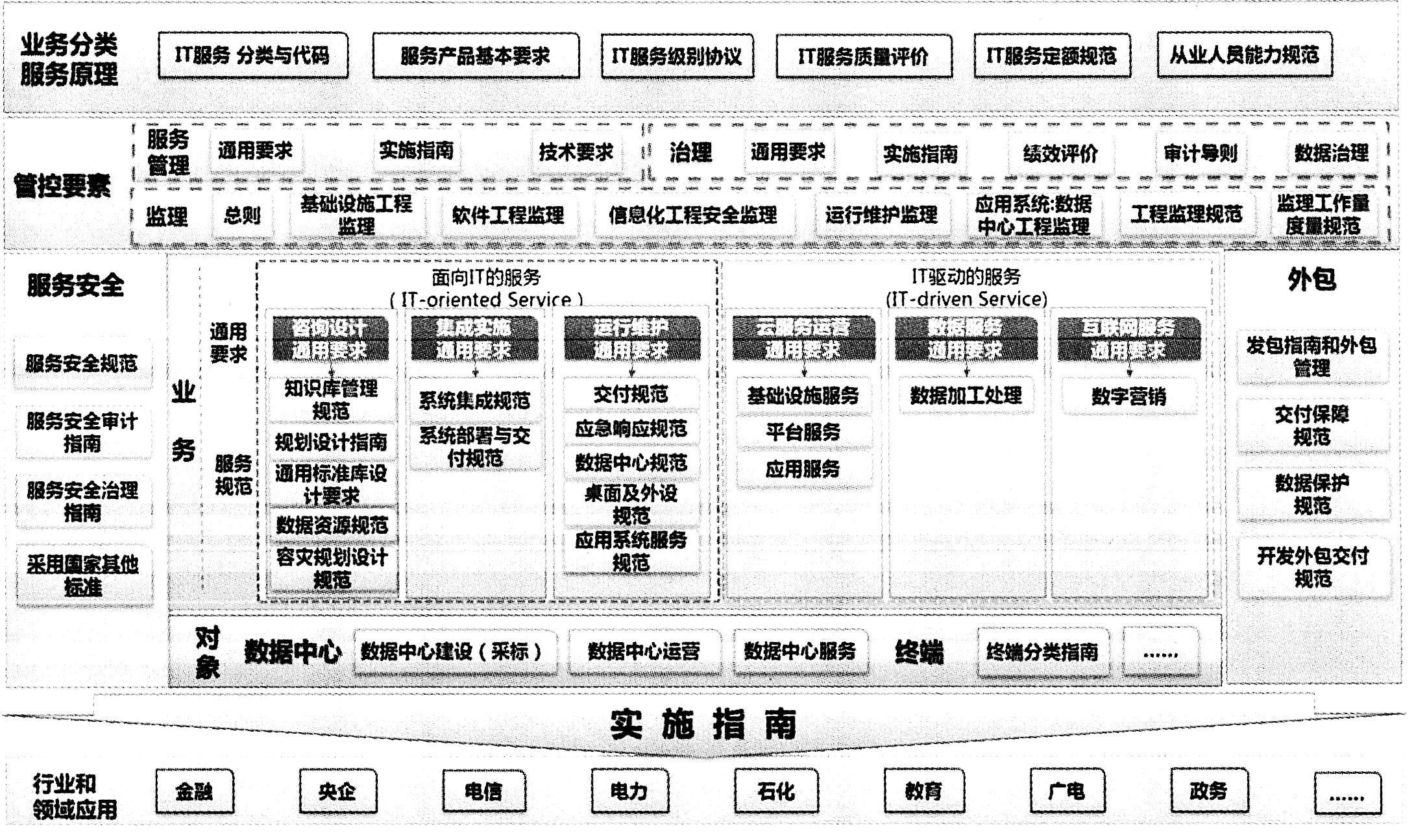 (2)服务管控标准是指通过对信息技术服务的治理、管理和监理活动,以确保信息技术服务的管控经济有效。阐述治理的要求、实施、指标、审计以及对数据的治理;阐述服务管理的方法、实现以及技术规范;阐述信息技术服务各个环节和层面的监理规范等。