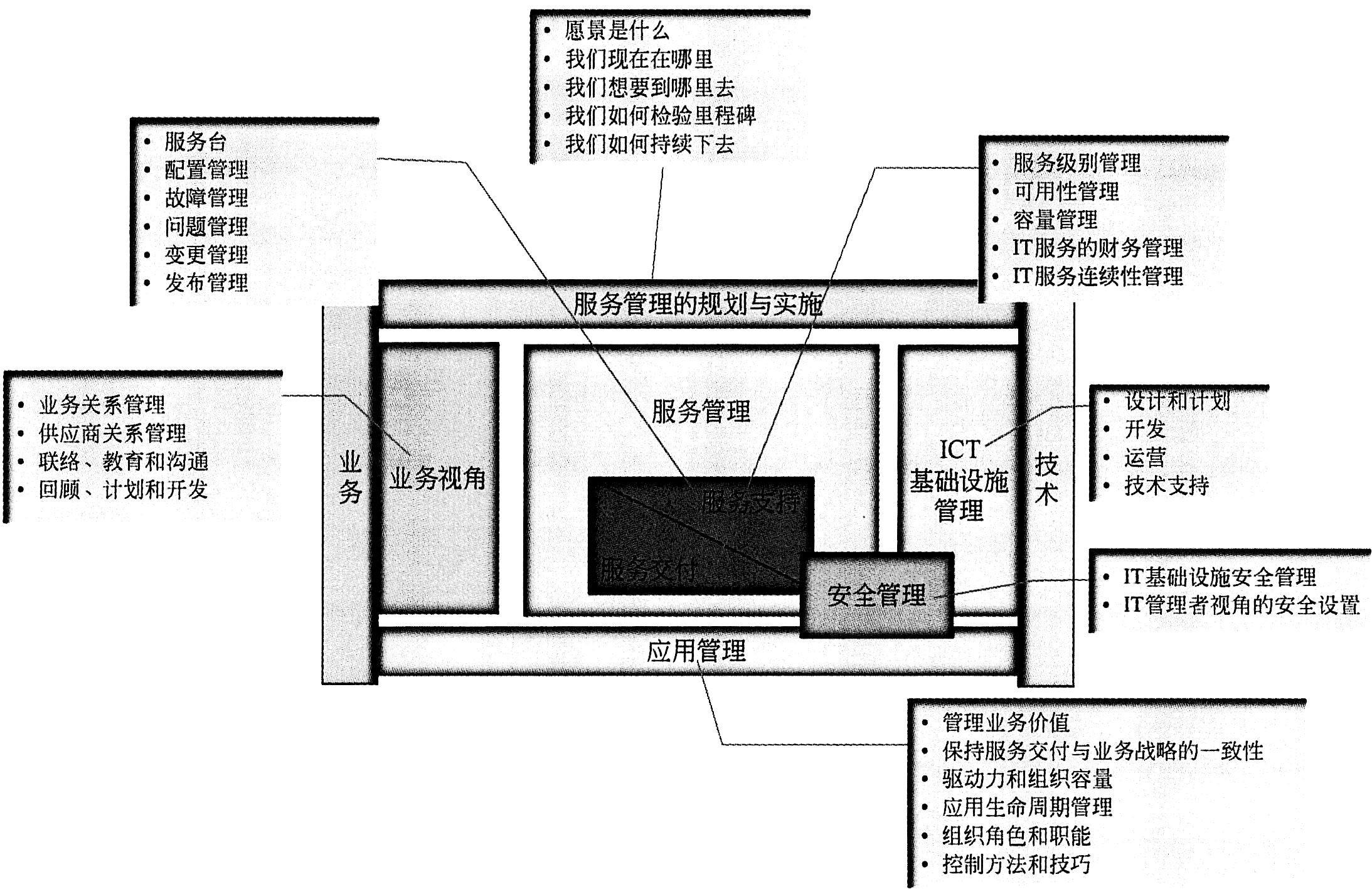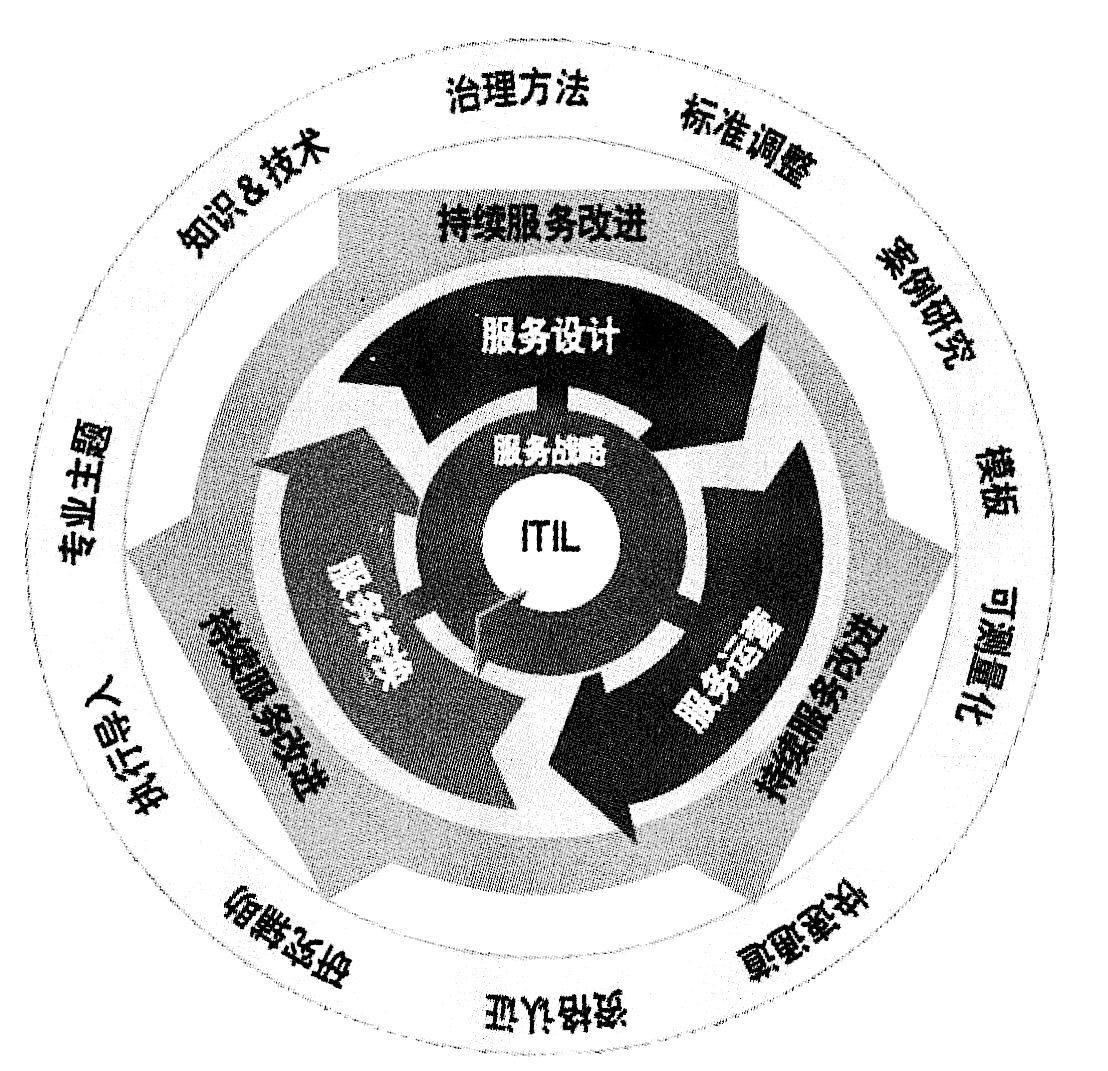 ITIL(Information Technology Infrastructure Library,IT基础架构库)从复杂的IT管理活动中梳理出各组织所共有的最佳实践(如事件管理、问题管理、变更管理、配置管理、服务水平管理、可用性管理等),然后将这些流程规范化、标准化,明确定义各个流程的目标、范围、职能和责任、成本和效益、规划和实施过程、主要活动、主要角色、关键成功因素、绩效评价指标以及其他流程的相互关系等。