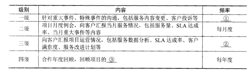 为提高服务回顾的有效性,小王特制定如下服务回顾机制。请帮小王补充完整以下表格