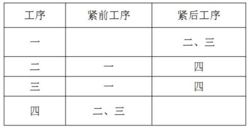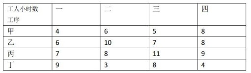 一个活动有4道工序,一个工作只能负责1道工序。每名工人工作完成各工序所需小时数如表1所示,工序间的依赖关系如表2所示。完成该活动最少需要(37)小时。