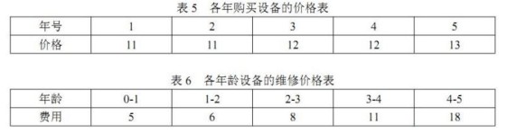 一家公司需要确定使用期为5年的一种设备的更换策略。己知各年购买设备的价格和各年龄设备的维修价格如表5和表6所示: