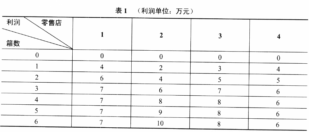 有一辆货车每天沿着公路给4个零售店运送6箱货物,如果各零售店出售该货物所得到利润如表1所示,适当规划在各零售店卸下的货物的箱数,可获得最大利润(66)万元。