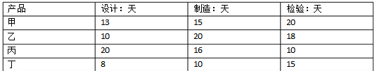 某企业计划研发甲、乙、丙、丁四种产品。每种产品必须依次由设计部门、制造部门和检验部门进行设计、制造和检验,而每个部门必须按同样的顺序处理这几种产品。各种产品各项工作所需的时间如下表: