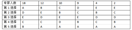 例如,有18位专家对项目的优选排序都是ADECB,依次类推。
