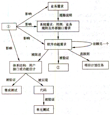 下图为需求跟踪过程中的相互影响能力链的局部示意图,图中空缺部分内容①、②分别应为()。