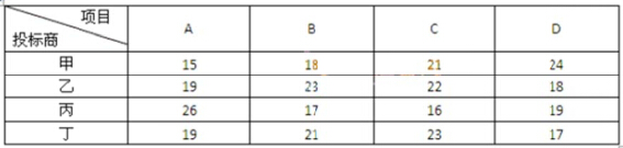 某公司要把4个有关能源工程项目承包给4个互不相关的外商投标者,规定每个承包商只能且必须承包一个项目,在总费用最小的条件下确定各个项目的承包者,总费用为()。(各承包商对工程的报价如下表所示)