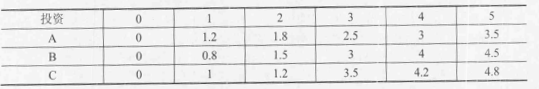 某公司拟将5百万元资金投放下属A、B、C三个子公司(以百万元的倍数分配投资),各子公司获得部分投资后的收益如下表所示(以百万元为单位)。该公司投资的总收益至多为()百万元。
