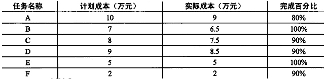 某项目经理将其负责的系统集成项目进行了工作分解,并对每个工作单元进行了成本估算,得到其计划成本。第四个月底时,各任务的计划成本、实际成本及完成百分比如下表: