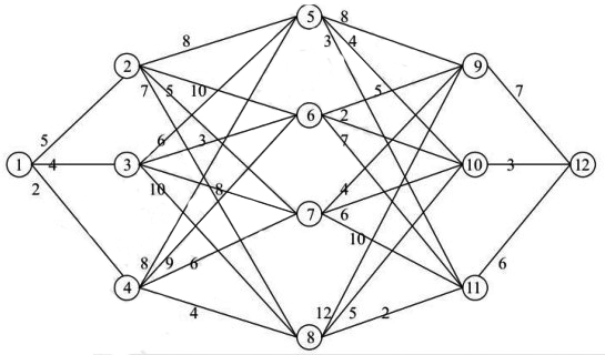 制造某种产品需要四道工序,每道工序可选用多种方法。下图列出了制造这种产品各道工序可选用的不同方法:从节点1开始,连续经过4条线段(表示4道工序所选用的方法),组成一条线路,直到节点12结束。每条线段上标记的数字表示利用相应方法每件产品可以获得的利润(元)。企业为了获取最大利润,需要找出从节点1到节点12的一条线路,使其对应的各道工序的利润之和达到最大。利用运筹方法计算后可知,制造每件产品可以获得的最大利润是 (70)元。