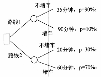 下图是一个选择出行路线的“决策树图”,统计路线1和路线2堵车和不堵车的用时和其发生的概率(P),计算出路线1和路线2的加权平均用时,根据计算结果选择出行路线。以下结论中,正确的是:(34)。