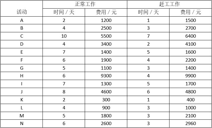 下表给出了该项目各项作业正常工作与赶工工作的时间和费用。