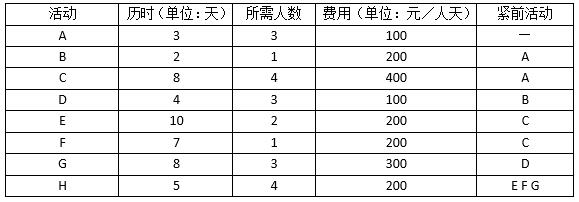 阅读下列说明,回答问题1至问题4,将解答填入答题纸的对应栏内。 【说明】 已知某信息工程由A、B、C、D、E、F、G、H八个活动构成。项目的活动历时、活动所需人数、费用及活动逻辑关系如下表所示: