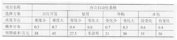 某机构拟进行办公自动化系统的建设,有四种方式可以选择:①企业自行从头开发;②复用已有的构件;③外购现成的软件产品;④承包给专业公司开发。针对这几种方式,项目经理提供了如下表所示的决策树。其中在复用的情况下,如果变化大则存在两种可能,简单构造的概率为0.2,成本约31万元;复杂构造的概率为0.8,成本约49万元。据此表,管理者选择建设方式的最佳决策是()。