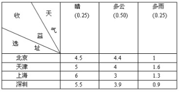 某公司希望举办一个展销会以扩大市场,选择北京、天津、上海、深圳作为候选会址。获利情况除了会址关系外,还与天气有关。天气可分为晴、多云、多雨三种。通过天气预报,估计三种天气情况可能发生的概率为0.25、0.50、0.25,其收益(单位:人民币万元)情况见下表。使用决策树进行决策的结果为(61)。