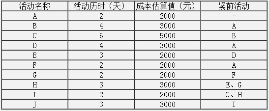信息系统项目包含A、B、C、D、E、F、G、H、I、J十个活动。各活动的历时、成本估算值、活动逻辑关系如下表所示:
