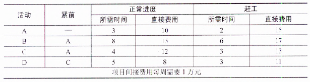 某项工程的活动明细如下表(时间:周:费用:万元):