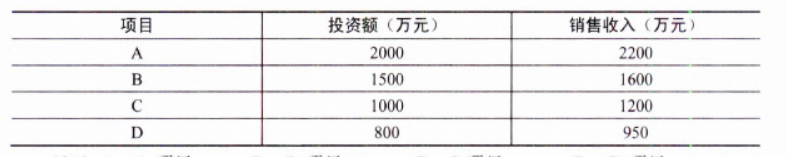 下表列出A、B、C、D四个项目的投资额及销售收入,根据投资回报率评估,应该选择投资()。