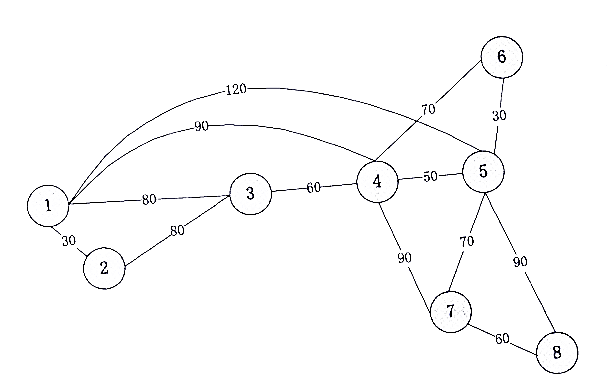 工程师小张需要完成图中所有区域的巡检工作,图中圆圈代表巡检地点,两点之间的连接线为可行的交通线路,连接线为可行的交通路径,连接线上所标识的数字为两点之间所需的交通费用(单位:元),从地点1开始完成巡检(不需要按数字顺序也无需返回起点)所需的最少交通费为()元。