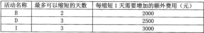 在项目开始前,客户希望将项目工期压缩为19天,并愿意承担所发生的所有额外费用。经过对各项活动的测算发现,只有活动B、D、I有可能缩短工期,其余活动均无法缩短工期。活动B、D、I最多可以缩短的天数以及额外费用如下: