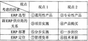 下表是关于ERP 的典型观点,综合考虑该表中列出的各种因素,选项(6)代表的观点是正确的。