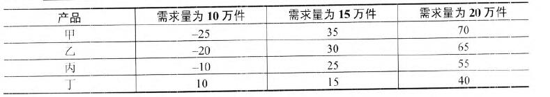 某公司主营产品有甲、乙、丙、丁四种。按照历史数据预测,下半年的市场需求总量可能有 10 万件、15 万件和 20 万件三种情况,对应的概率分别为 50%、30%、20% 不同情况下各产品带来的市场收益(单位:万元)如表所示。为了追求利润最大化,该公司应该生产()。