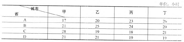 有A、B、C、D四个临省,同时向甲、乙、丙、丁四个城市运送援助物资,假设规定一个省对口援助一个城市。四省到各城市的运输时间如下表所示。请给出一个合理的方案,使得物资运输总时间最短,则最短物资运输时间为()时。