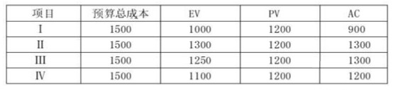 项目Ⅰ、Ⅱ、Ⅲ、Ⅳ的工期都是三年,在第二年末其挣值分析数据如下表所示,按照趋势最早完工的应是项目(57)。